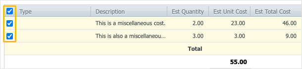 - Select the checkboxes for the costs you want to delete, or select the checkbox in the header row to select all costs in the list: