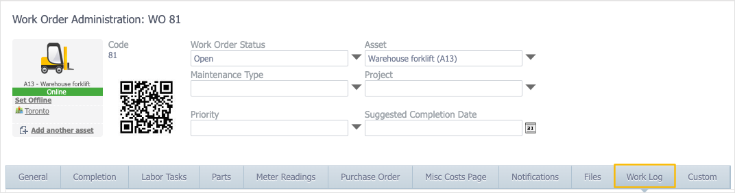 - If the work order you want to view the work log for isn't already open, click it in the work order list (in Maintenance > Work Orders).
