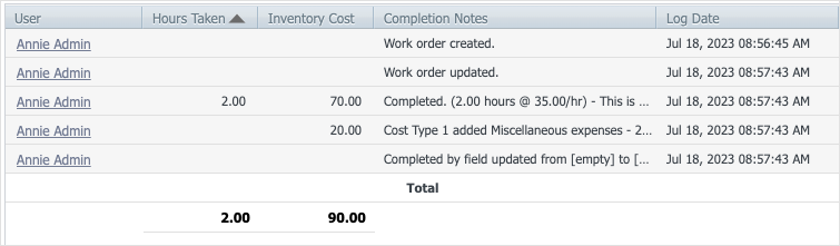A work log displays a record of updates to a work order, as well as the hours and costs spent to complete the work order.