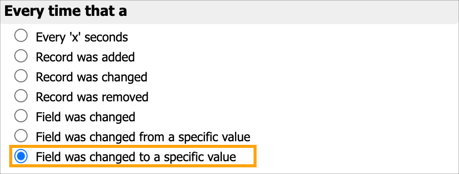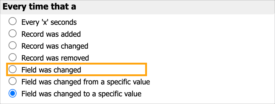 The Field was changed trigger allows you to run a workflow every time a specific field was edited, regardless of the value it was changed to or from. For example, you could use this trigger to run a workflow every time someone changes a work order’s priority.