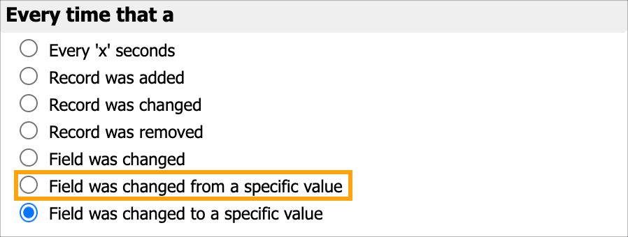 The Field was changed from a specific value trigger allows you to run a workflow whenever a specific field is changed from a specific value. For example, you could use this trigger to run a workflow whenever someone changes a work order’s status from closed to another status (i.e. reopens a work order that was previously closed).