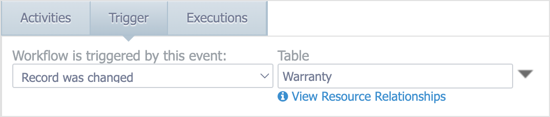 This trigger only has one setting. In the Table drop-down list, select the table that corresponds to the type of record being edited. Continuing the example above, you would select the Warranty table: