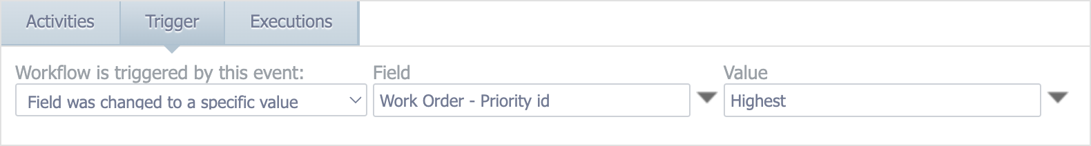 | Field | Select the field you want to use in the trigger. Continuing the example above, you would select Work Order > Priority ID. |