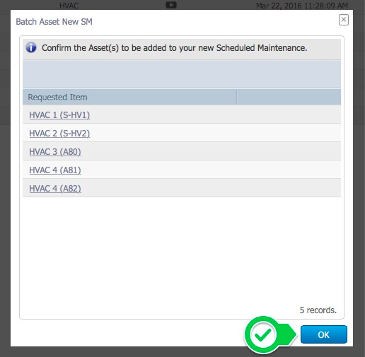 3. Click OK to confirm the assets to be added to the new scheduled maintenance. See here to configure and activate the multi asset scheduled maintenance