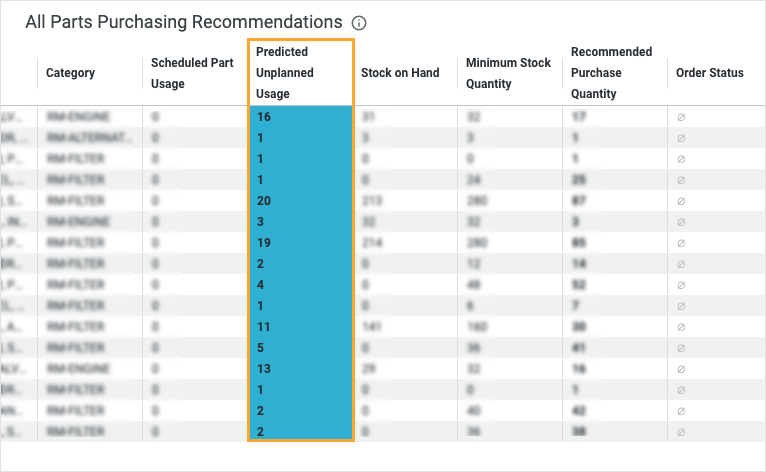 We also updated the Parts Forecaster dashboard to better differentiate between scheduled and predicted parts usage. The Predicted Unplanned Usage column now has a blue highlight so that you can quickly find your part predictions: