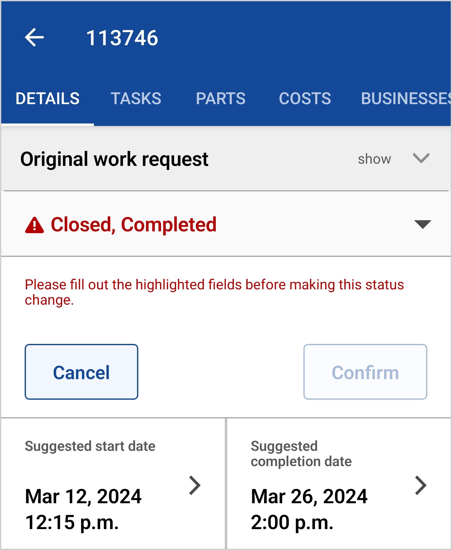 - (iOS and Android) When work order completion notes are marked as required but state-based access is disabled, closed work orders will display as read-only to the user on mobile.