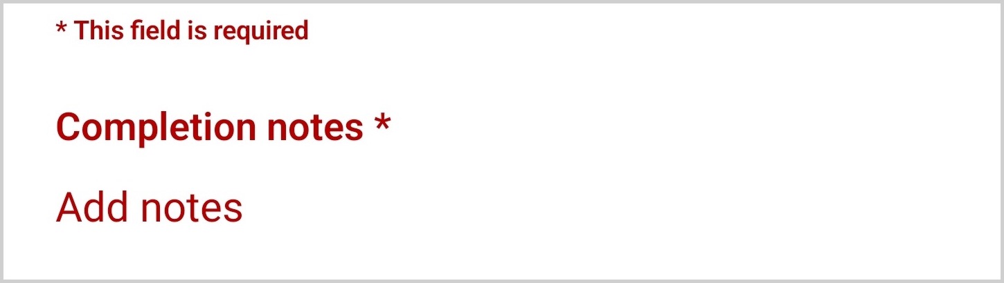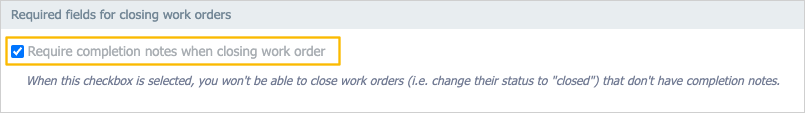 Selecting the Require completion notes when closing work order checkbox requires users to enter completion notes if they try to close a work order without them: