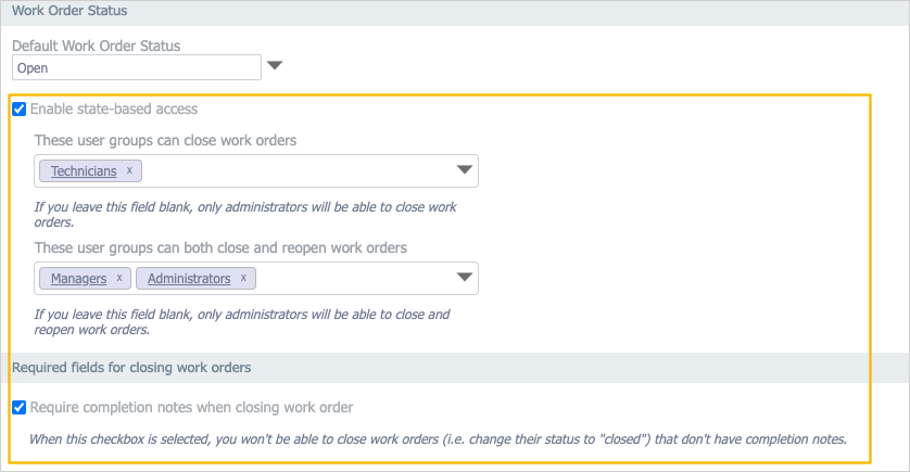 Enabling state-based access allows you to set which user groups can close and reopen work orders: