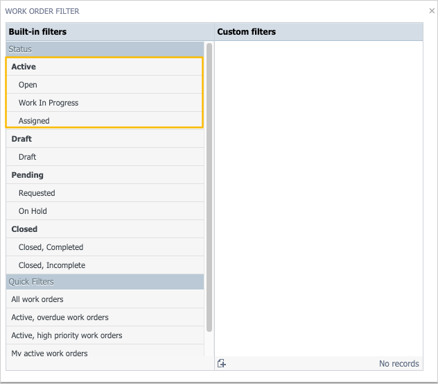 If the Start As Work Order Status is not set to a status that belongs to the Active control, then the generated work order will not display in the list of assigned work orders. You can open your work order filters to view which statuses belong to each control: