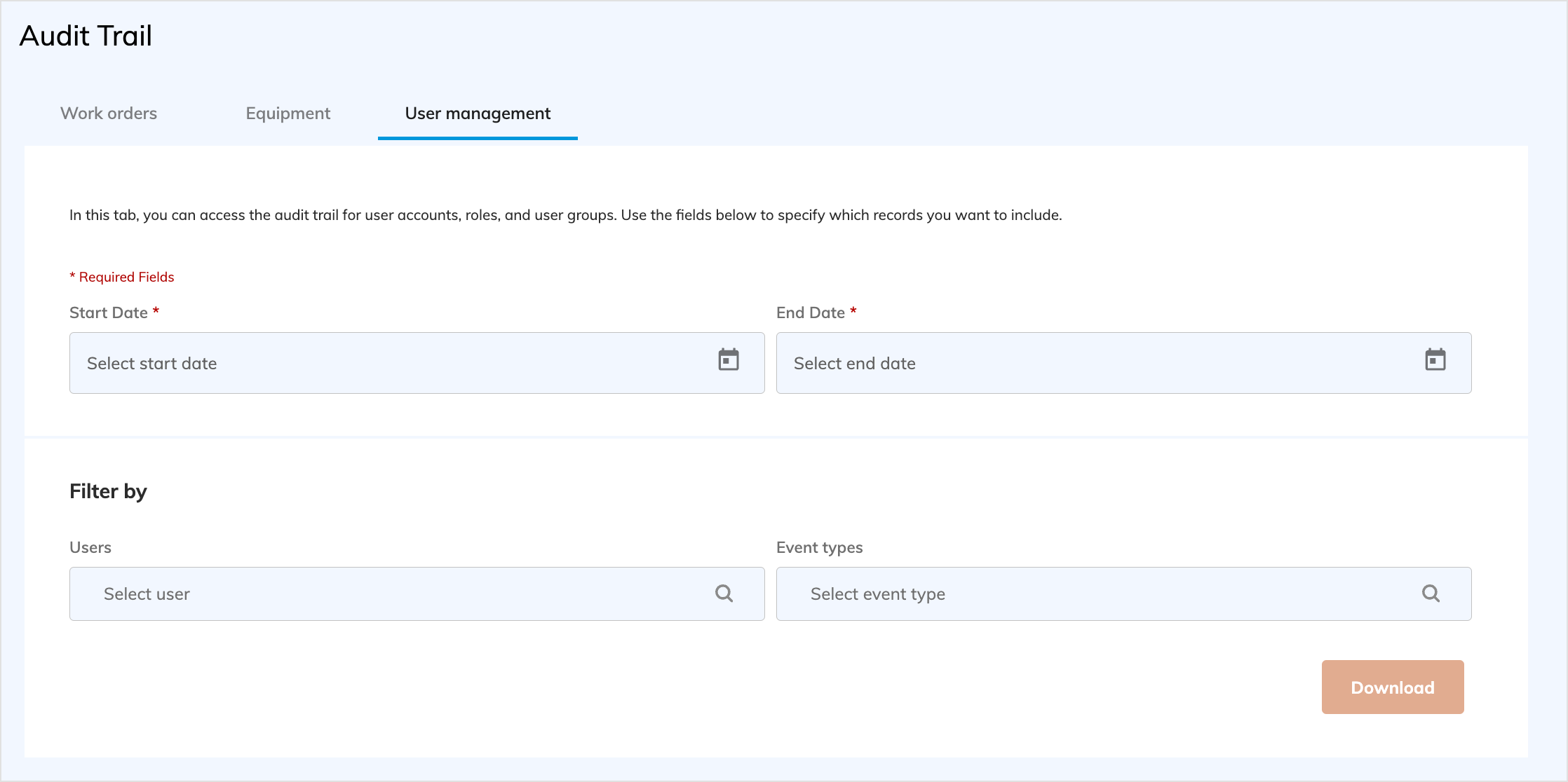 Similar to the functionality already available for work orders and equipment, you can view a change log for user management activities in Audit Trail. This is helpful for auditing and troubleshooting, as it allows you to track down when (and by whom) specific changes were made.