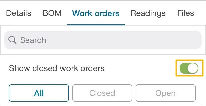 To reopen a work order in an asset record, navigate to the Work Orders tab within the asset. Make sure the Show closed work orders toggle is on, as displayed below: