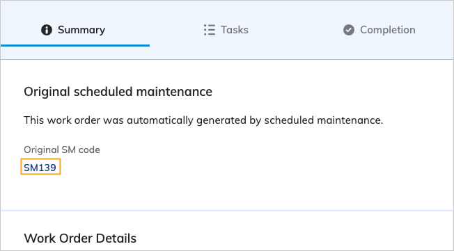 You can now access the original scheduled maintenance record directly from any SM-generated work orders. To do this, click the SM code on the work order: