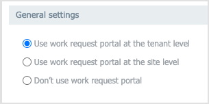 | Use work request portal at tenant level | Select this option to enable the portal at the tenant level. For more information, see the definitions above. |