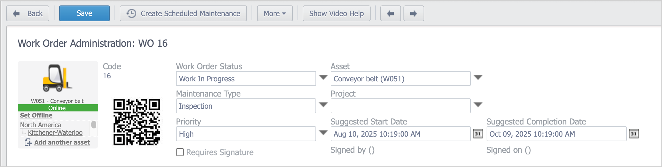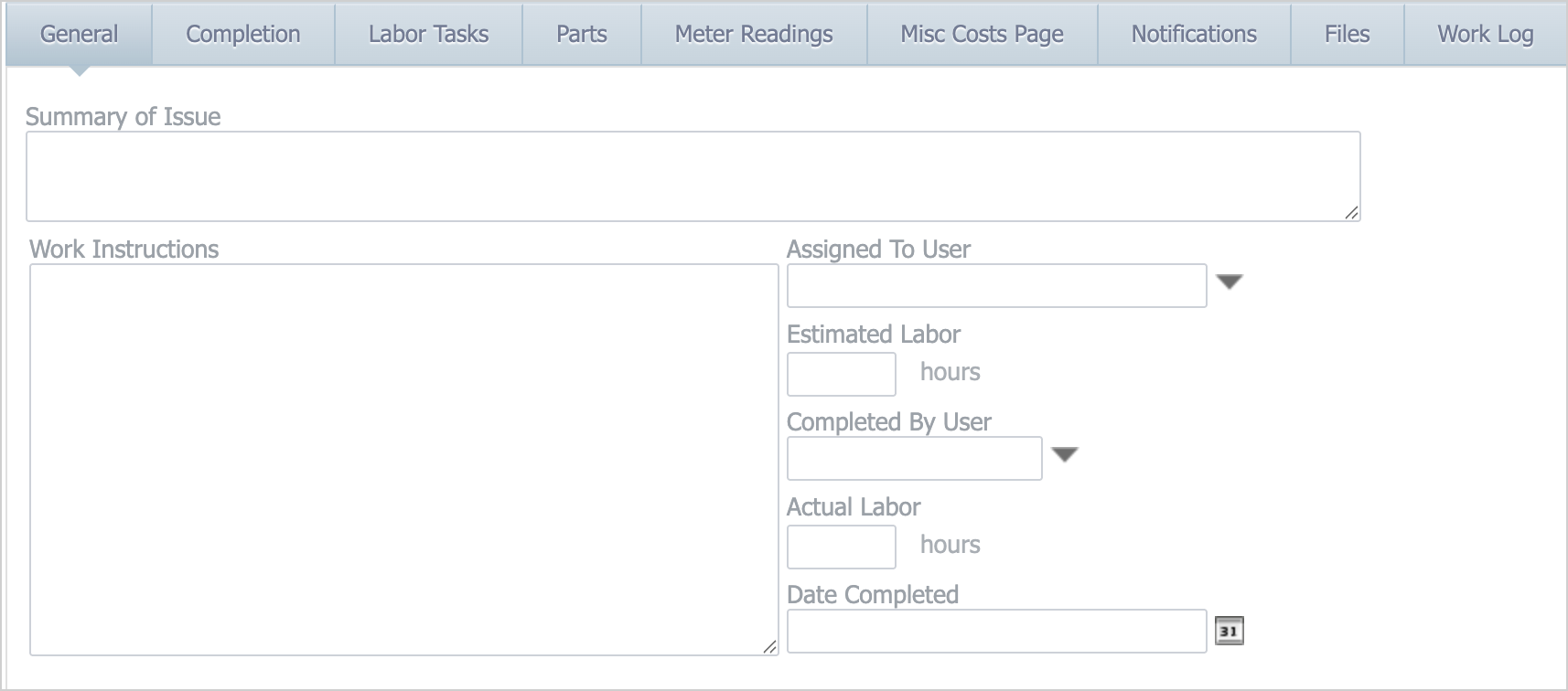 Field name Description Example Work Order Status The work order's completion status. Open Maintenance Type The type of maintenance being performed in this work order. Preventive Priority The work order's priority. High Asset The asset the work order is performed on. X-ray machine Suggested Completion Date The date that the work order should be completed by. May 01, 2023 04:30:00 PM - (Optional, these fields can be populated anytime) Fill out the fields in the General tab as needed: