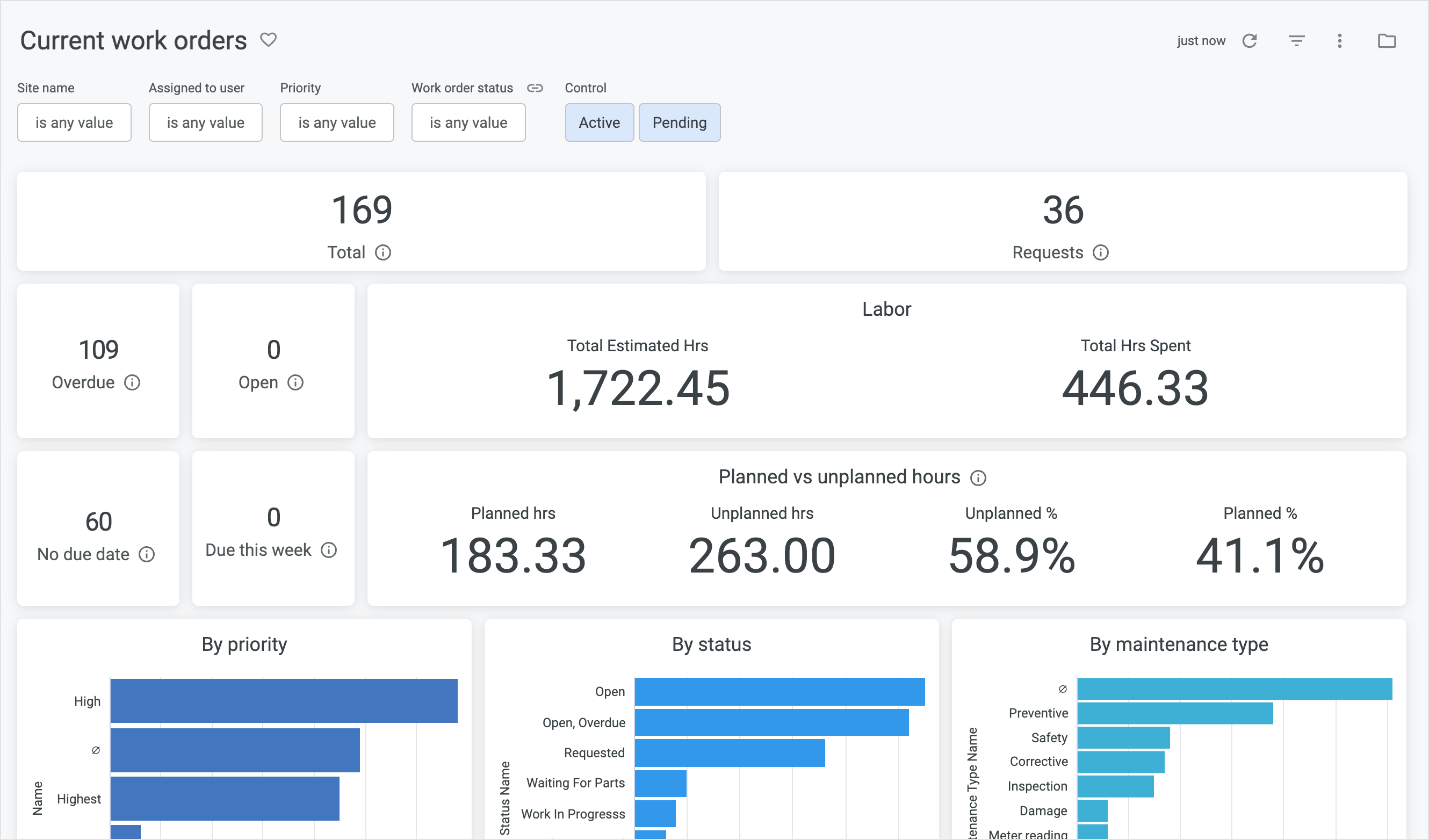 This dashboard provides insights into your current open work orders (i.e. work orders in an active or pending status). These insights include how many are overdue, planned vs unplanned percentage, PM compliance, and more.