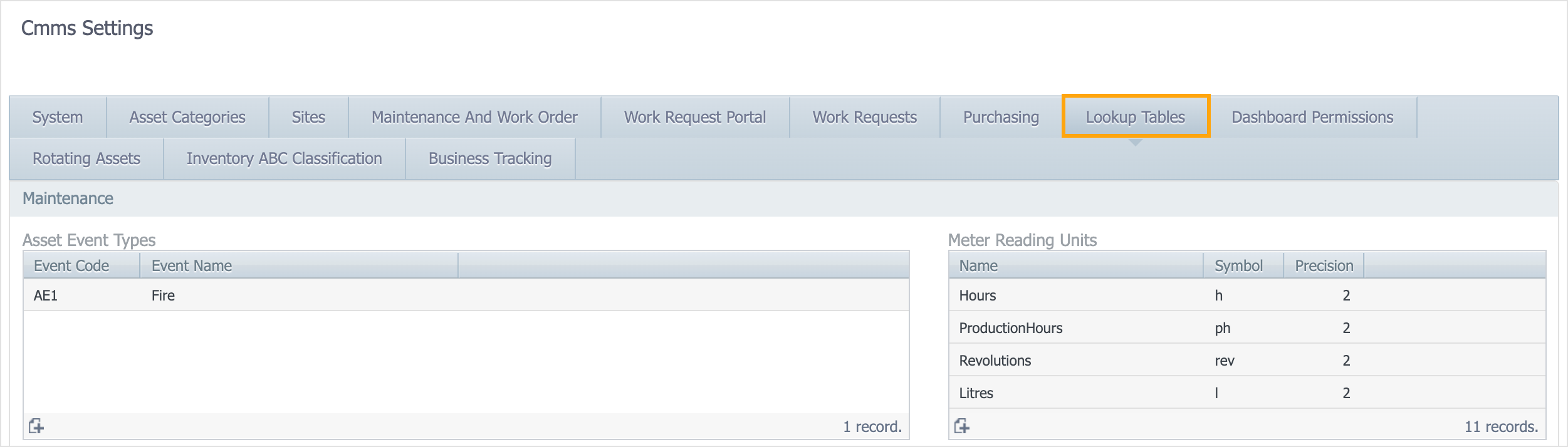 | Asset event types | The events that you can record in the CMMS. You can configure scheduled maintenance to trigger whenever one of these events is recorded against an asset. |