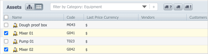 Filter the list as needed. For example, you may want to filter by asset category. - Select the assets you want to add to the scheduled maintenance record: