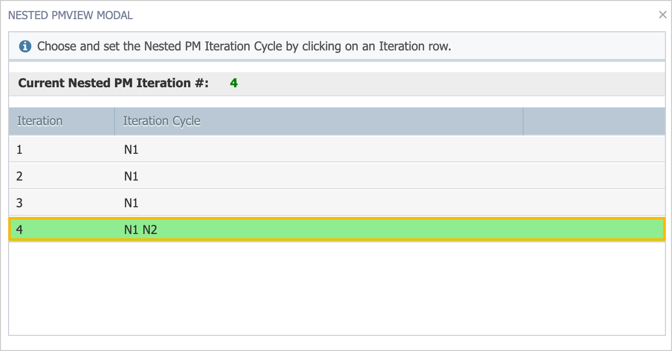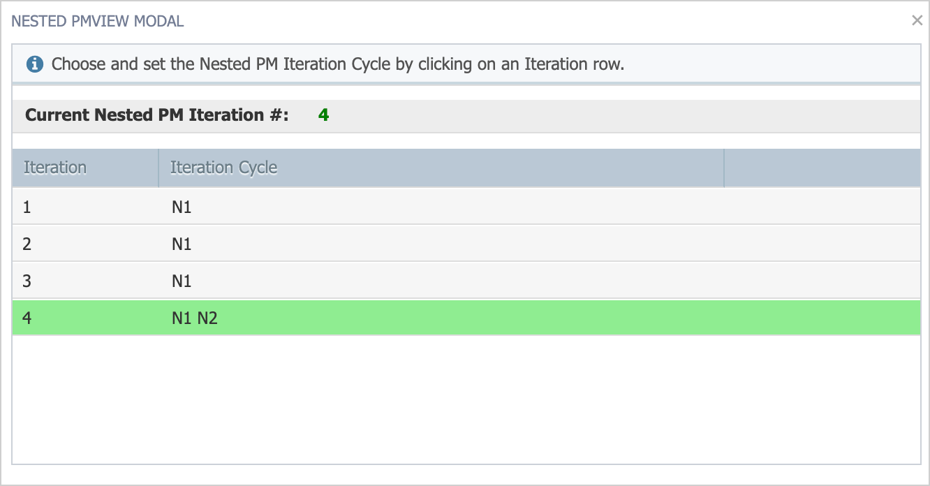 - In the Nested PM View Modal, select the iteration you'd like to start with: