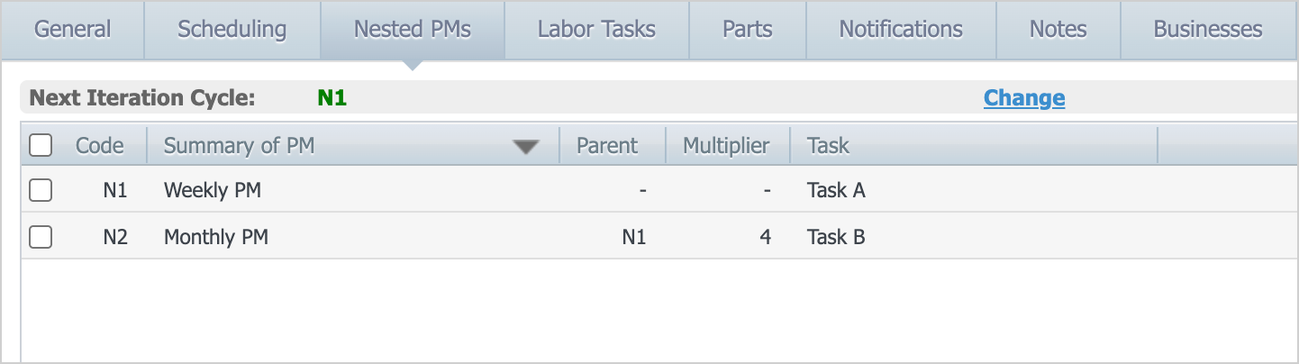 These nested PMs would have 4 iterations. Iterations 1 to 3 generate work orders that only include the weekly N1 tasks, and iteration 4 generates a work order with both the weekly N1 and monthly N2 tasks: