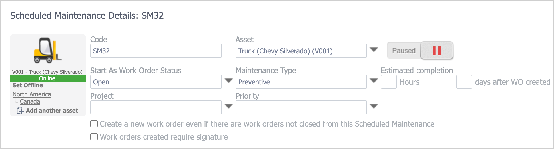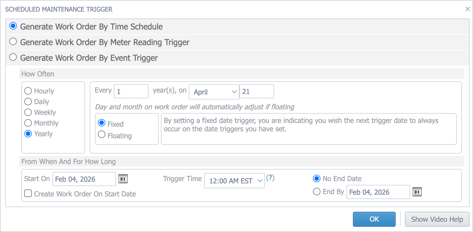 - Make sure Fixed is selected, and optionally deselect Create Work Order On Start Date if you don't want a work order to be created right away.