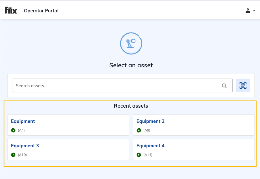 On the operator portal landing page is a search field for assets, a scan-code button, and a list of assets accessed by the user recently: